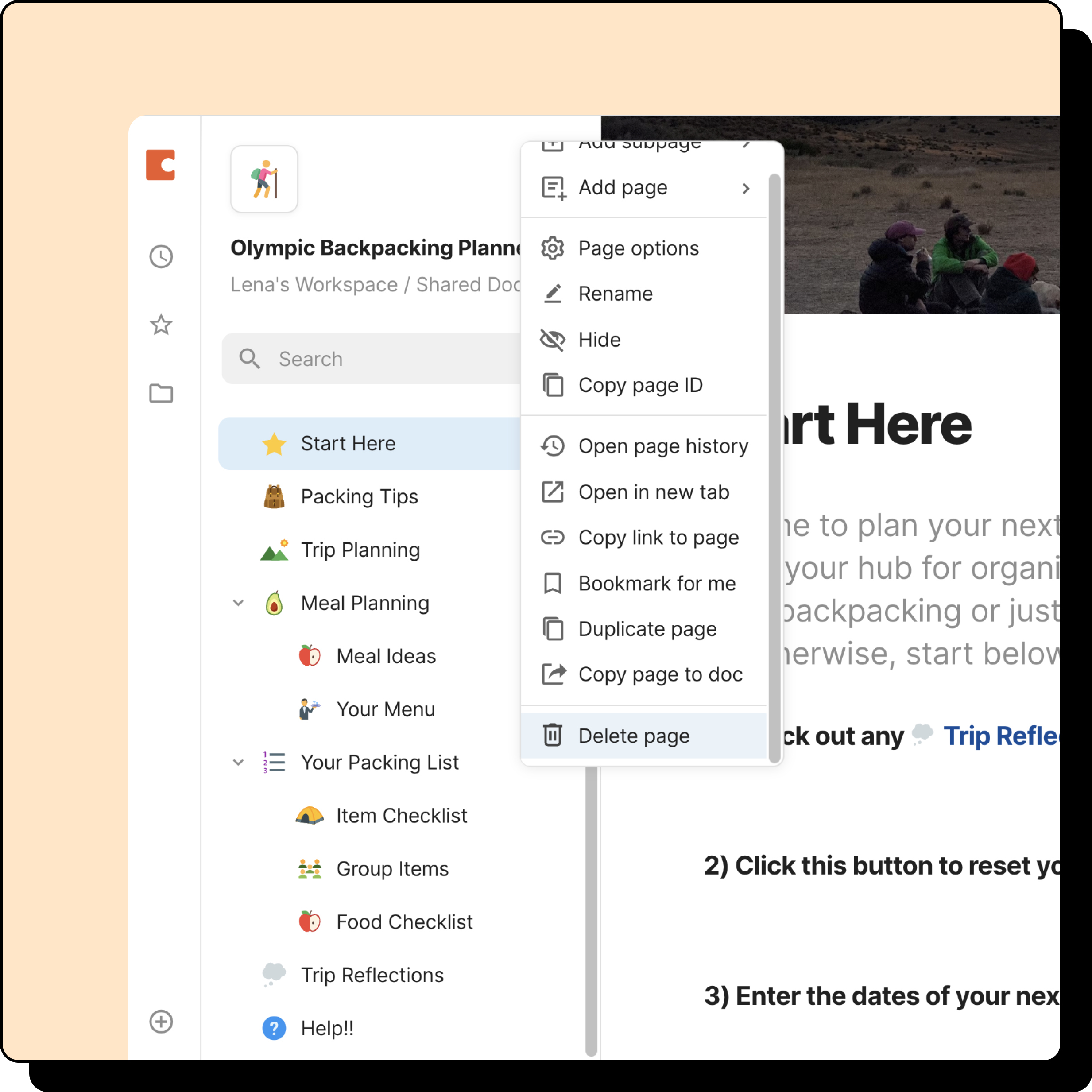 To delete a page, find it in the page list on the left hand side of your doc. Right click on the name, then select Delete page from the menu. Note that if the page has subpages beneath it, this action will also delete all of the subpages. If you don’t want the subpages to be deleted, first move them to another location in the page list.