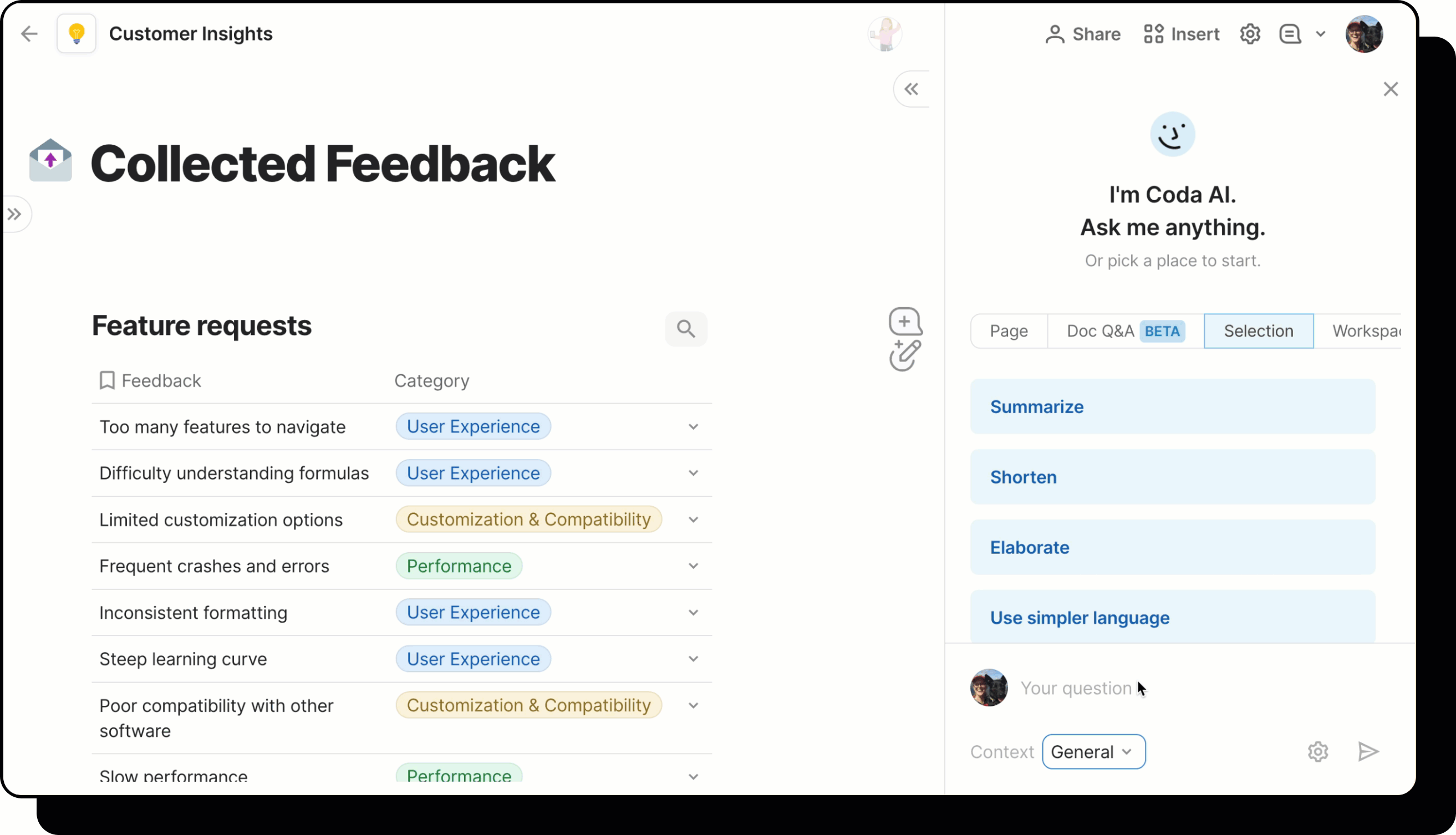 After Coda AI generates a response, you can add it to the current page (or open up a new one), by pressing insert.