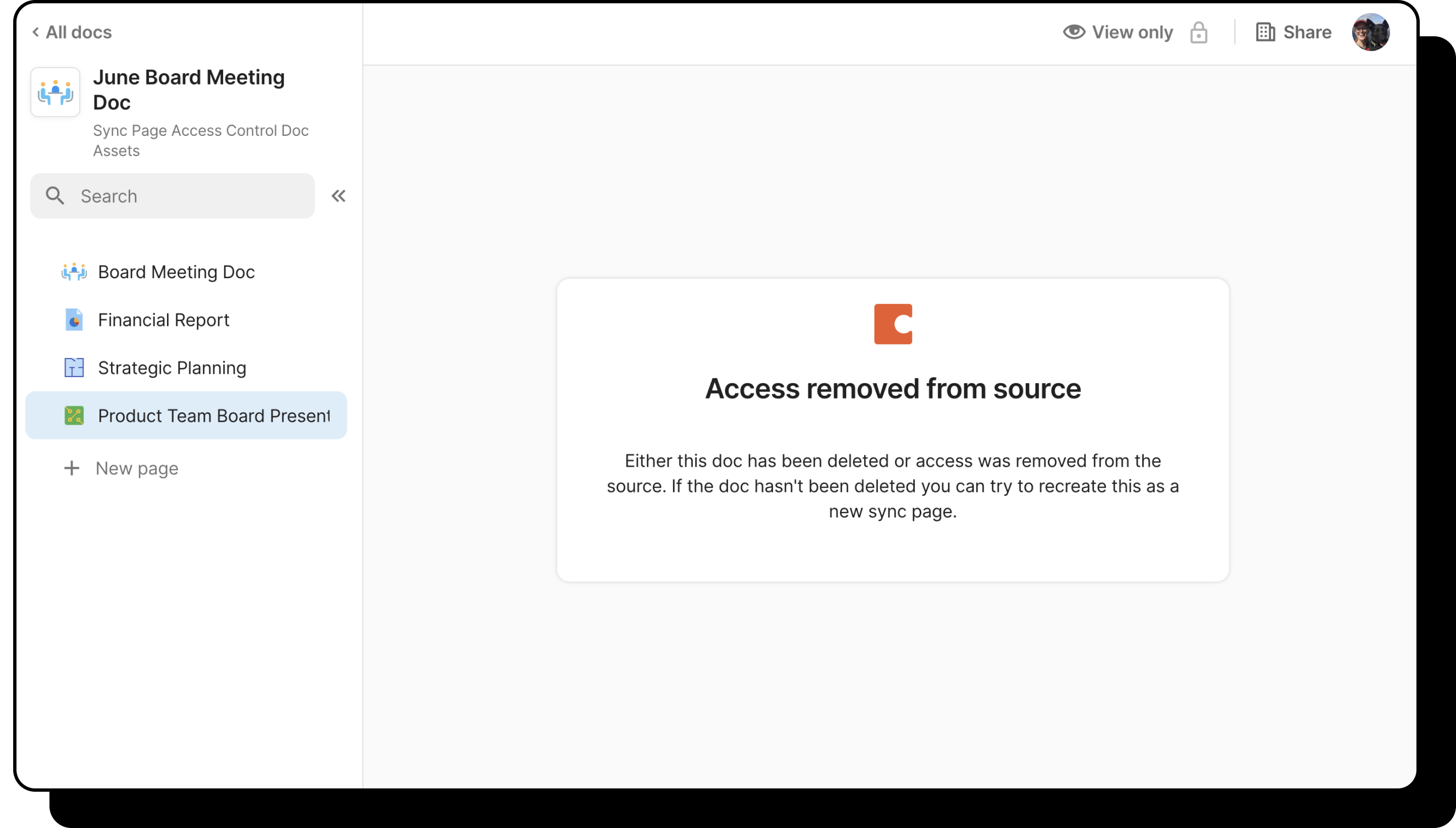 Source doc users have the option to remove access to sync pages via the source doc, as explained in the section above. When someone removes sync page access via the source doc, you will see this error message. To resolve this, we recommend re-creating the sync page.