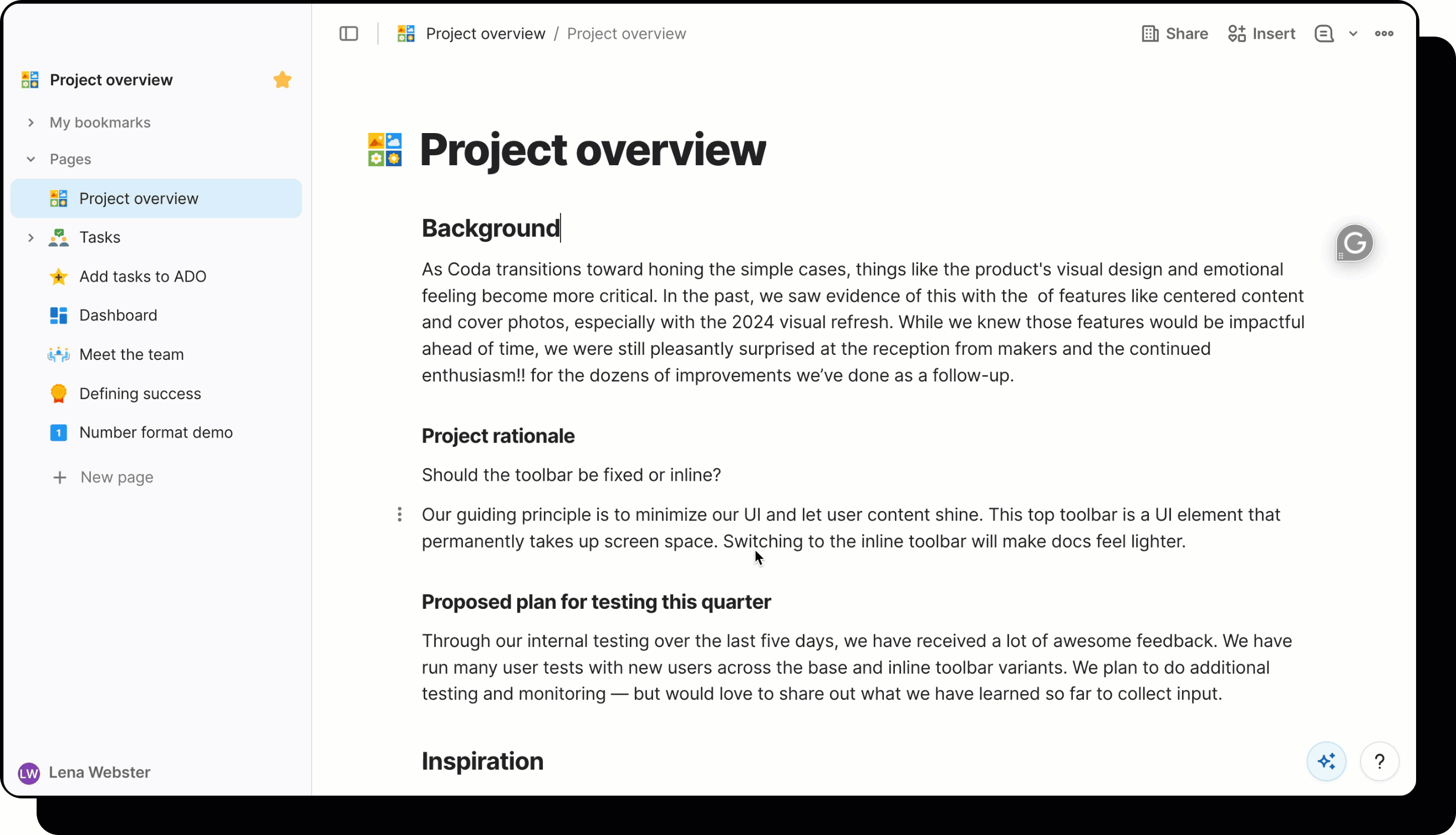 When viewing Coda docs, you have the option to choose between light mode (default) and dark mode. Dark mode can help save computer battery, reduce eye strain and blue light expose, and may also be more accessible for some viewers.