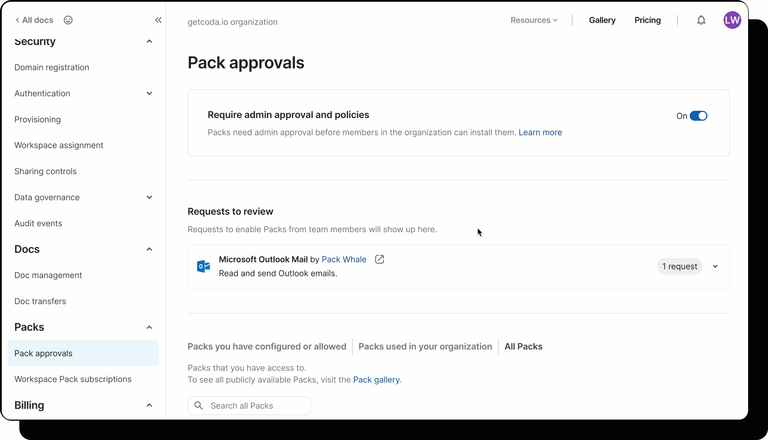 If you want to require admin approval for all Packs, you can toggle on the Require admin approval and policies setting, which will require org members to request approval anytime they want to add a new Pack to a doc. Org admins will then have to approve or deny each Pack request. Learn more about Pack requests and approvals here.