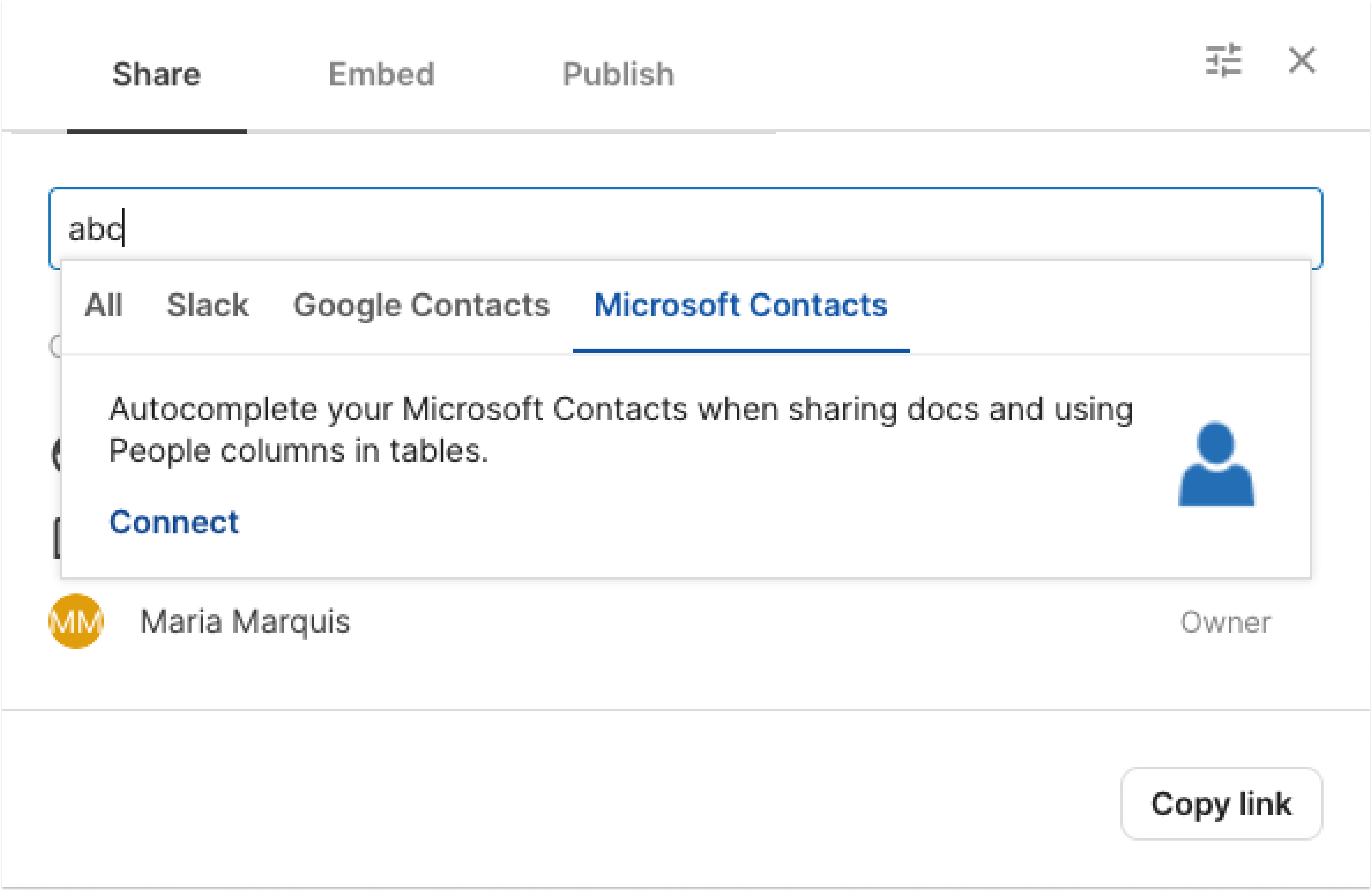 With the Outlook contacts integration, you can share with contacts from the Microsoft universe. Once you connect, typing a few letters in the share settings of your doc will pull up your contacts.